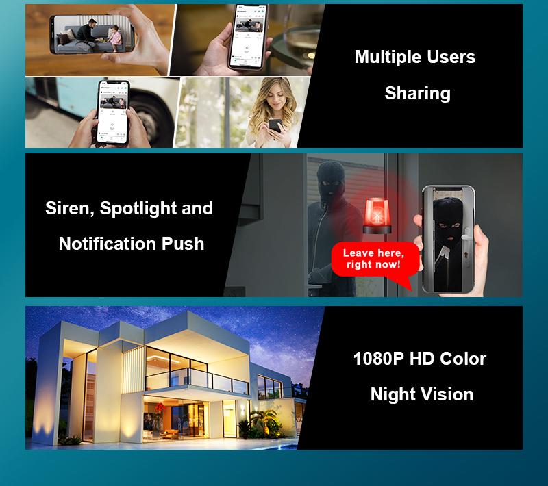 【Two-Way Audio, Instant Siren, Spotlight】This wireless security camera outdoor has a built-in microphone and speaker, you can make 2-way audio calls in real-time. The instant siren, flashing white light and 2-way talk can drive away thieves and unwanted visitors.